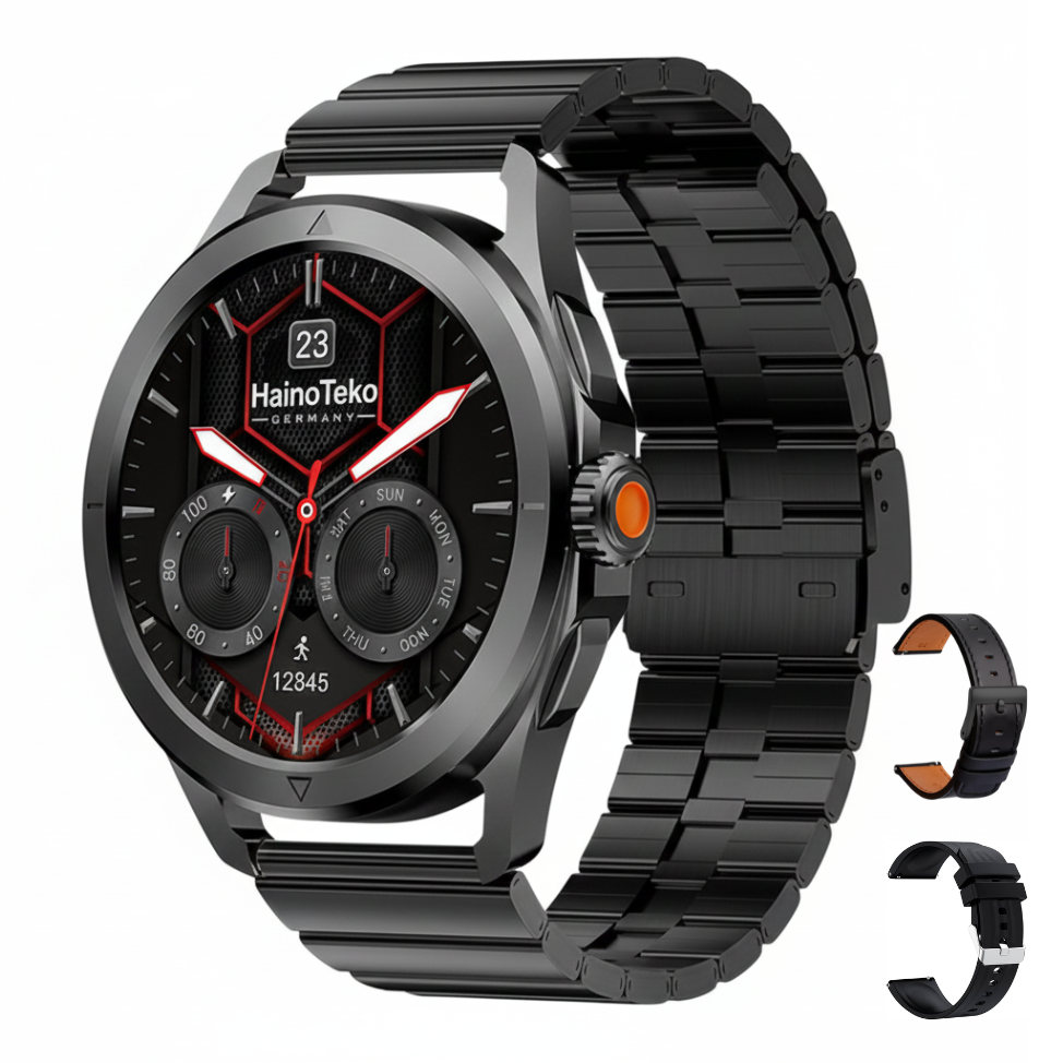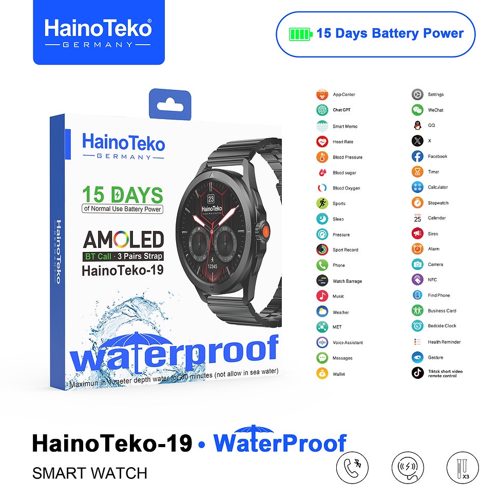 ساعة HainoTeko-19 الذكية، شاشة AMOLED فعلية، مكالمات Bluetooth، مقاومة ماء حقيقية، بطارية تدوم حتى 15 يوم، مع 3 أحزمة (معدن + جلد + سيليكون)