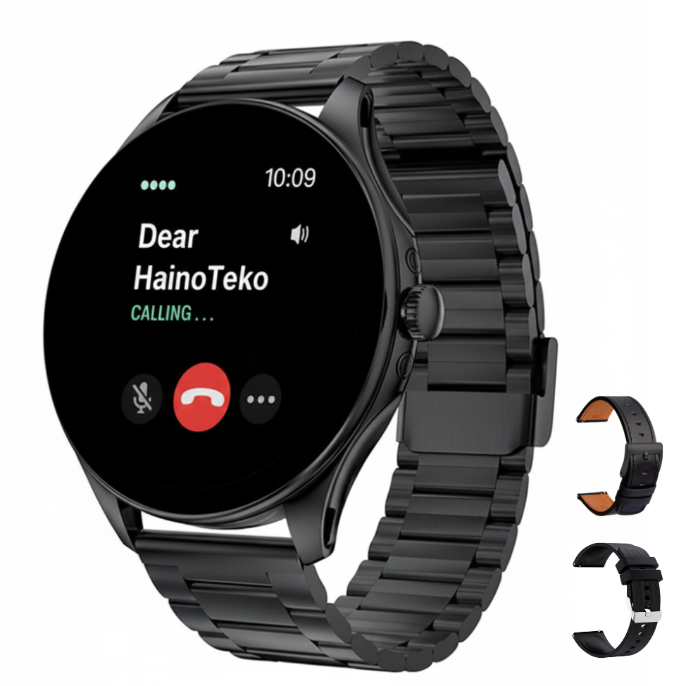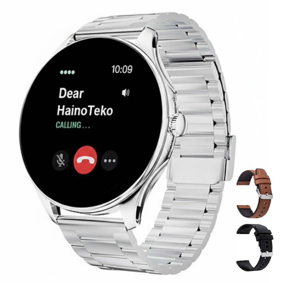 ساعة HainoTeko-26 الذكية – تصميم نحيف، شاشة AMOLED فعلية، مكالمات Bluetooth، مقاومة ماء حقيقية، بطارية تدوم حتى 15 يوم، مع 3 أحزمة (ستانلس + جلد + سيليكون)