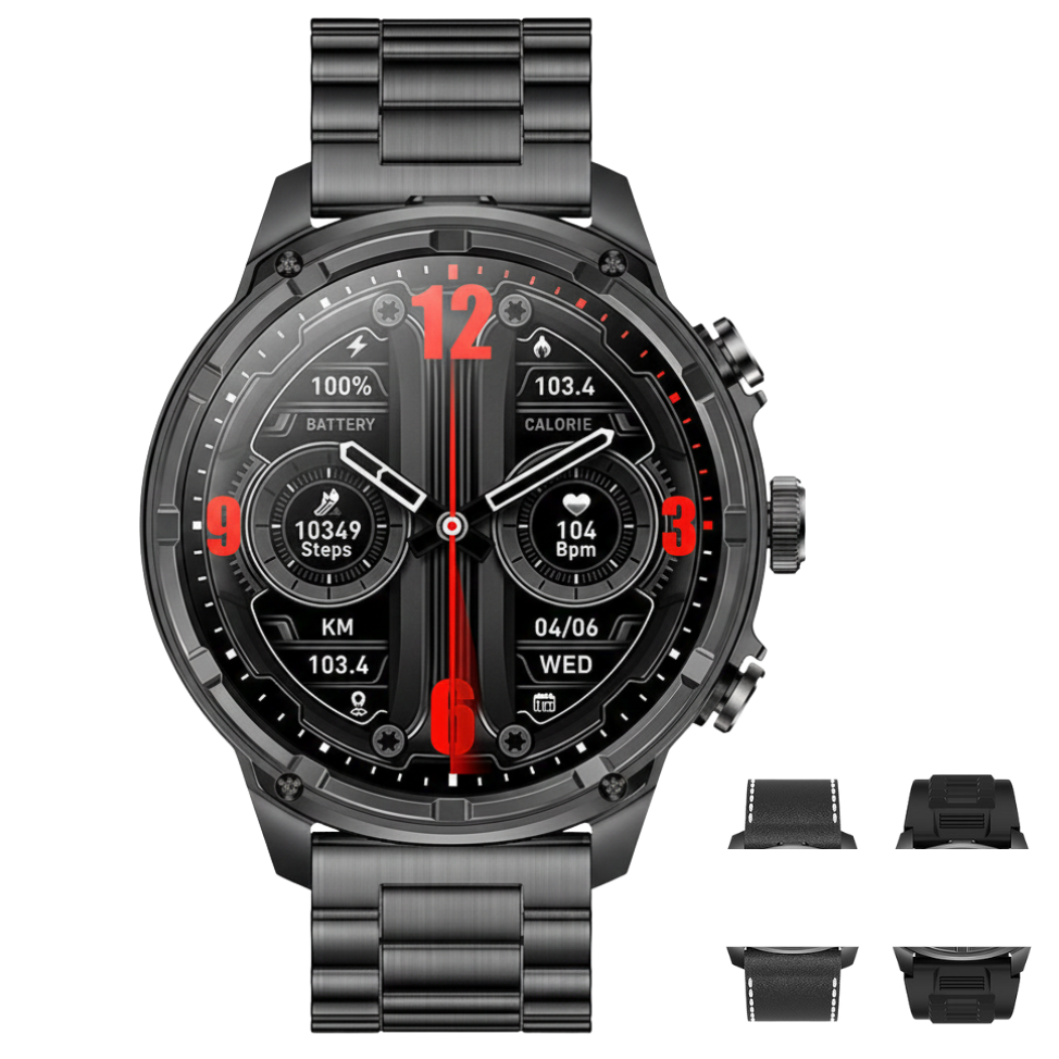 الأحزمة: تأتي مع 3 أحزمة داخل العلبة (ستانلس ستيل + جلد + سيليكون) لتغيير الشكل حسب المناسبة