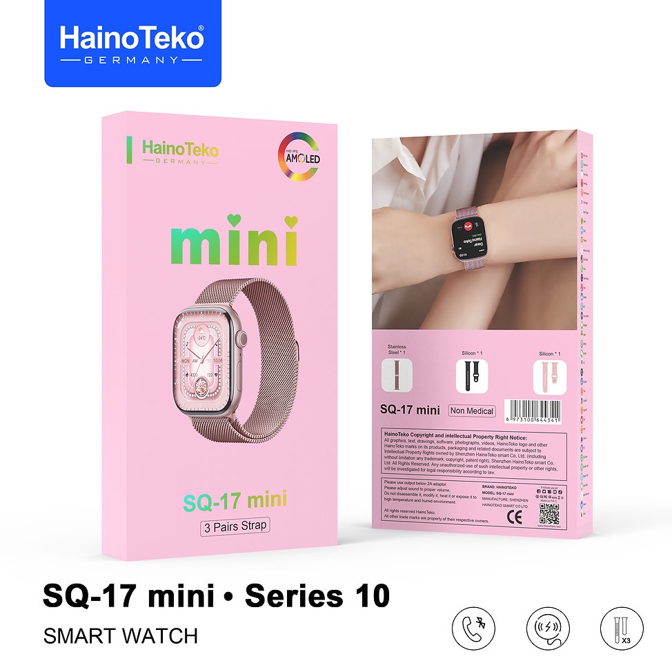 ساعة HainoTeko SQ 17 mini الذكية للنساء – تصميم صغير، شاشة HD بدقة عالية، مكالمات Bluetooth، بطارية 5–7 أيام، مع 3 أحزمة (ستانلس + جلد + سيليكون)